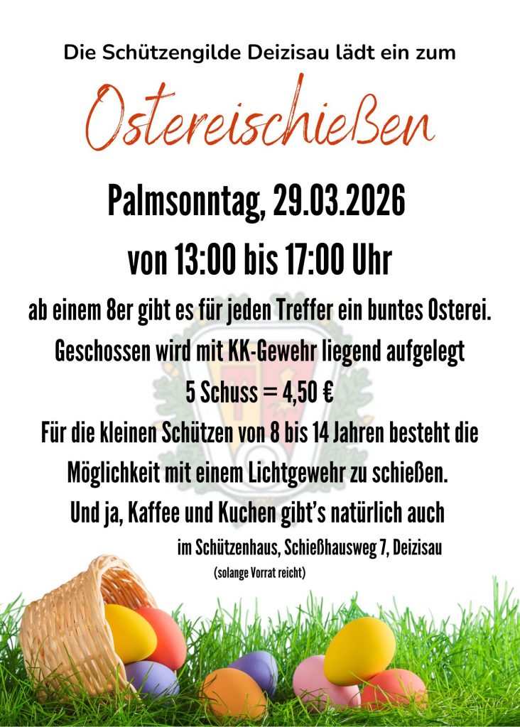 29.03.2026 Ostereischießen Christian Kopf 18. Februar 2026 News Share this content: Verschlagwortet Deizisau, Schießhausweg, Schützengilde, Schützenhaus Beitragsnavigation Zurück Vorheriger Beitrag: Rundenabschluss – Erster Platz nach 6 von 6 Wettkämpfen